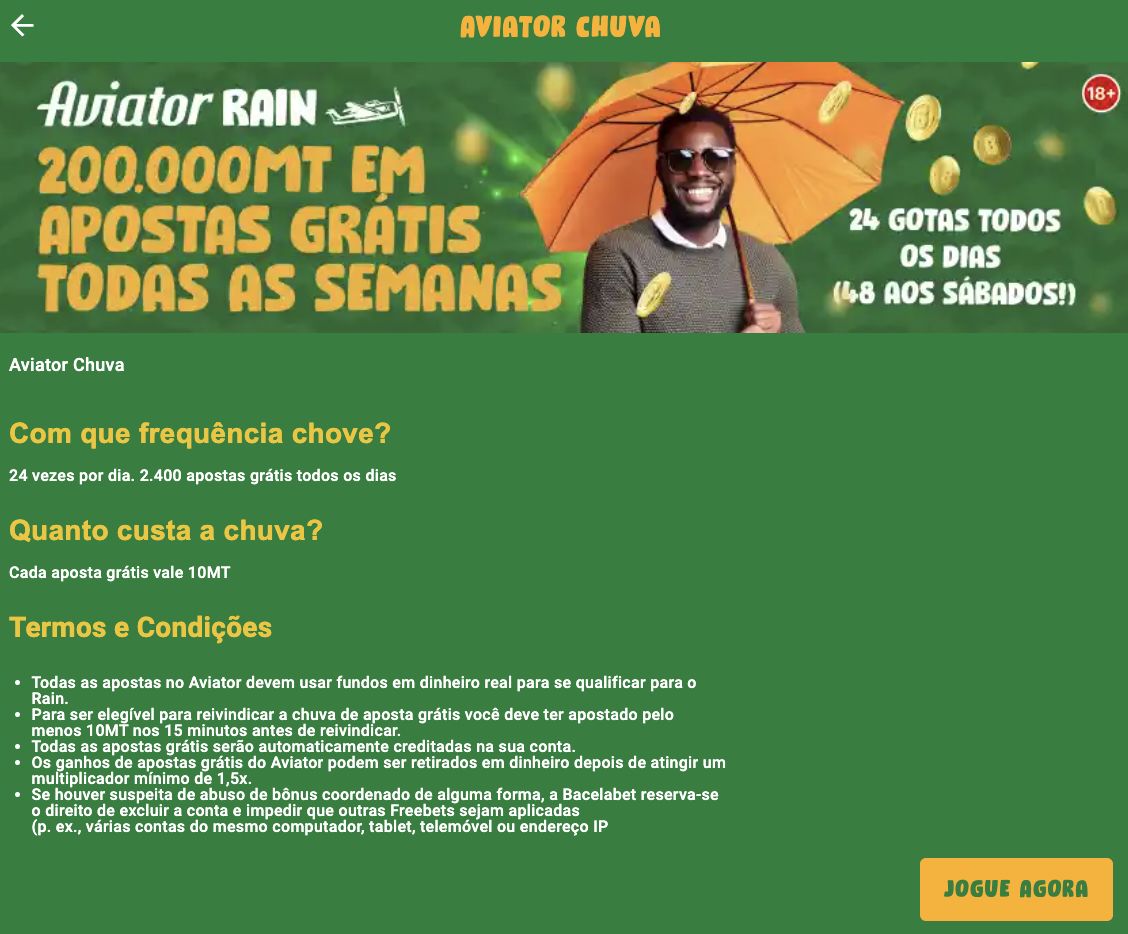 Para ganhar apostas grátis no Aviator Bacelabet, basta registar-se e depositar 15 MT através da M-Pesa. Esta oferta só é válida para novos utilizadores. Para quem já está registado pode ganhar apostas grátis 24 vezes por dia quando cair a chuva no Aviator.