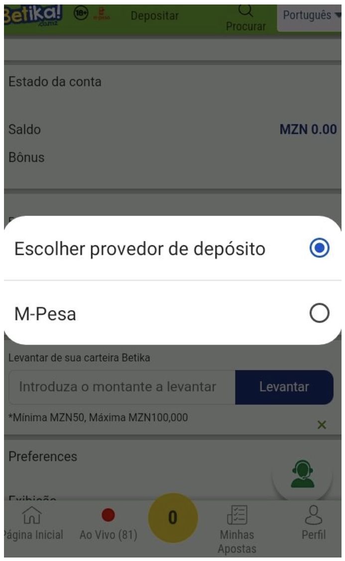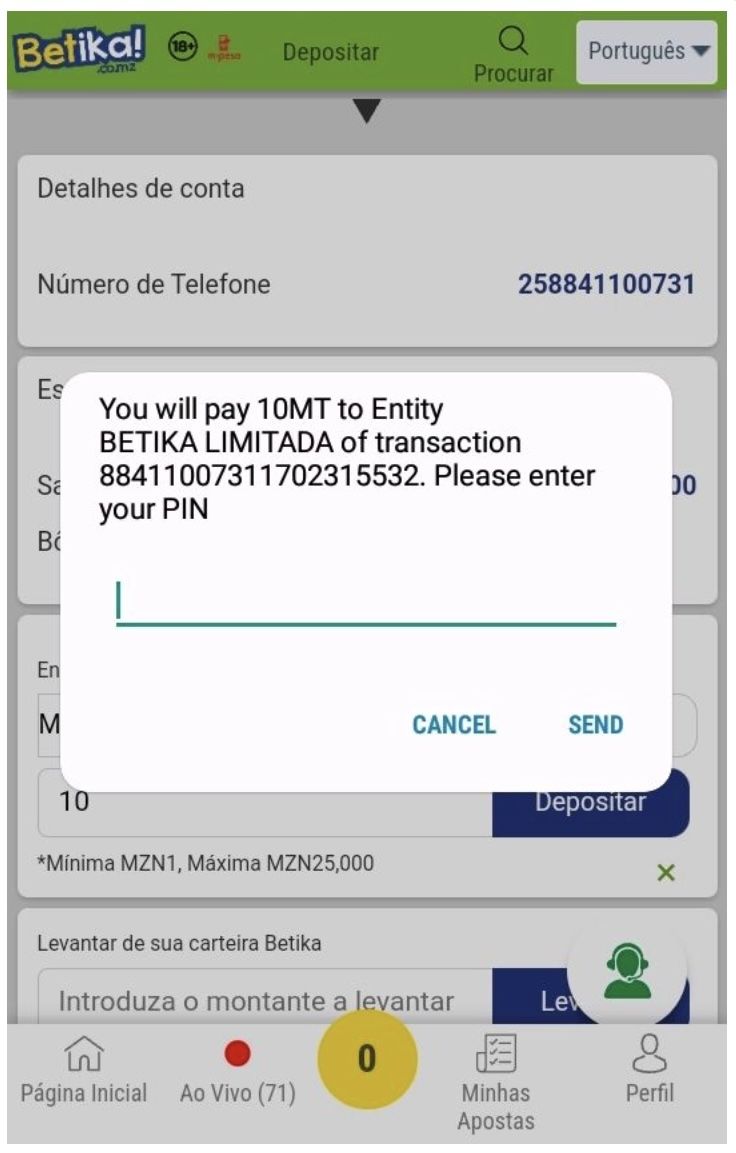 A Betika facilita a sua vida e os processos que tem que realizar como novo jogador. Ao registar-se ou fazer login na casa de apostas, aparecerá no seu ecrã, a janela de depósito junto aos seus dados de utilizador. Por aí pode fazer o seu primeiro depósito, escolhendo o seu provedor de depósito e inserindo o valor que deseja depositar. Pode, no entanto, depositar de outra forma: