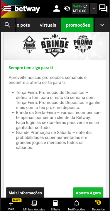 Com a Betway mobile o apostador aposta gratuitamente na secção “jackpot mahala” (termos e condições aplicáveis) e ganha até 25.000 MT com uma colocação de 0 MT, sim, é possível ganhar sem apostar dinheiro, e isso torna a Betway na casa de apostas mais voltada à essência do jogo de apostas, vencer em grande.