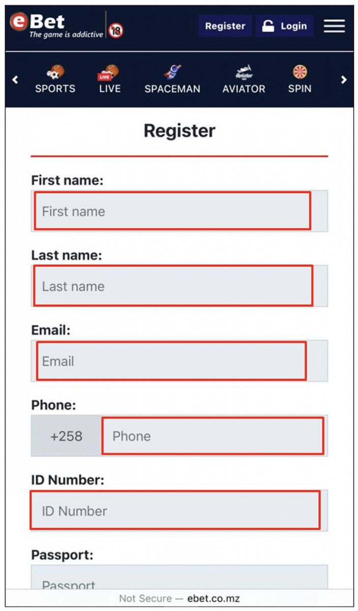 - Buscar pelo site da eBet, clicar na melhor opção e clicar em “Register” no canto superior direito da sua tela;