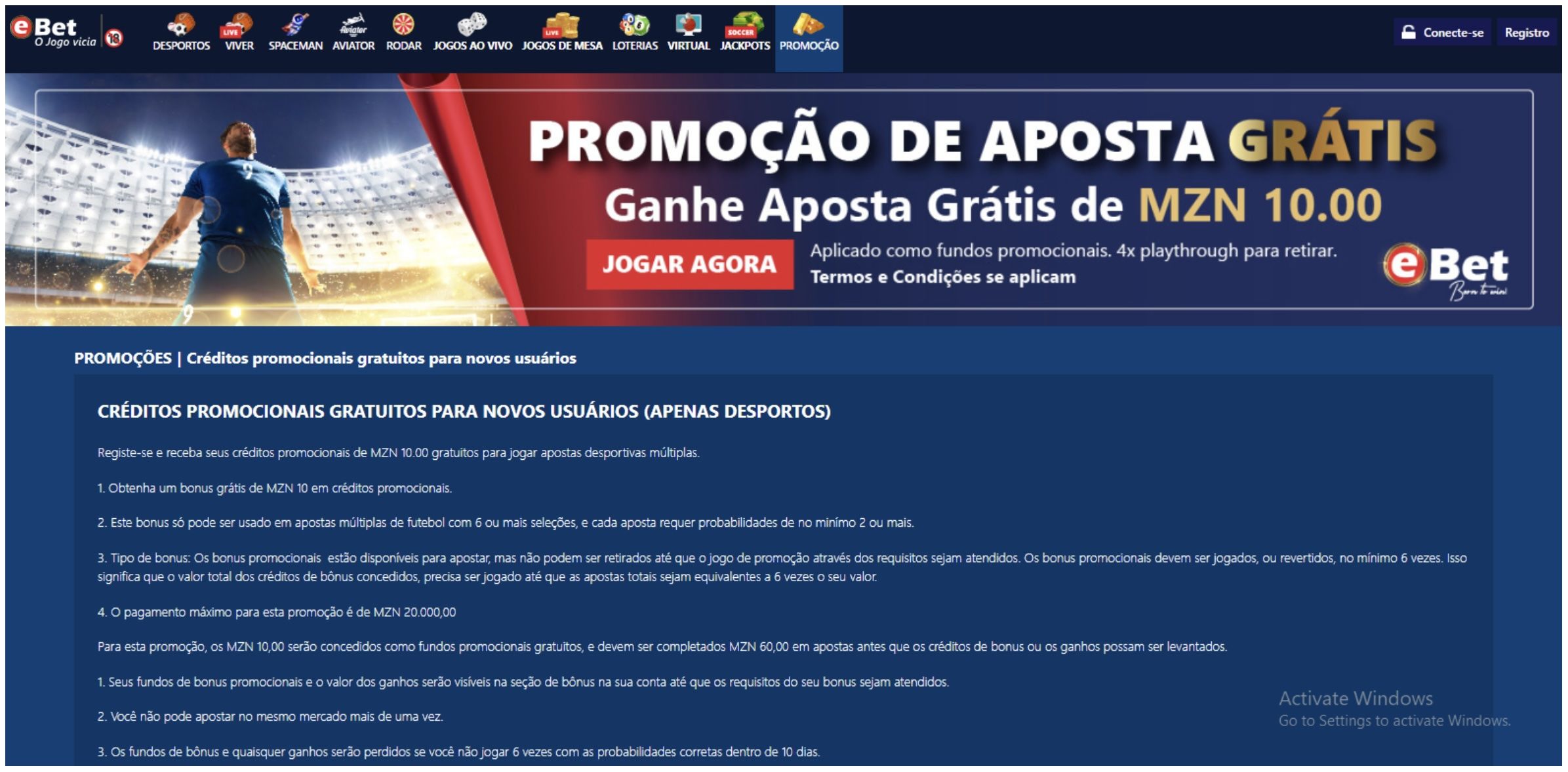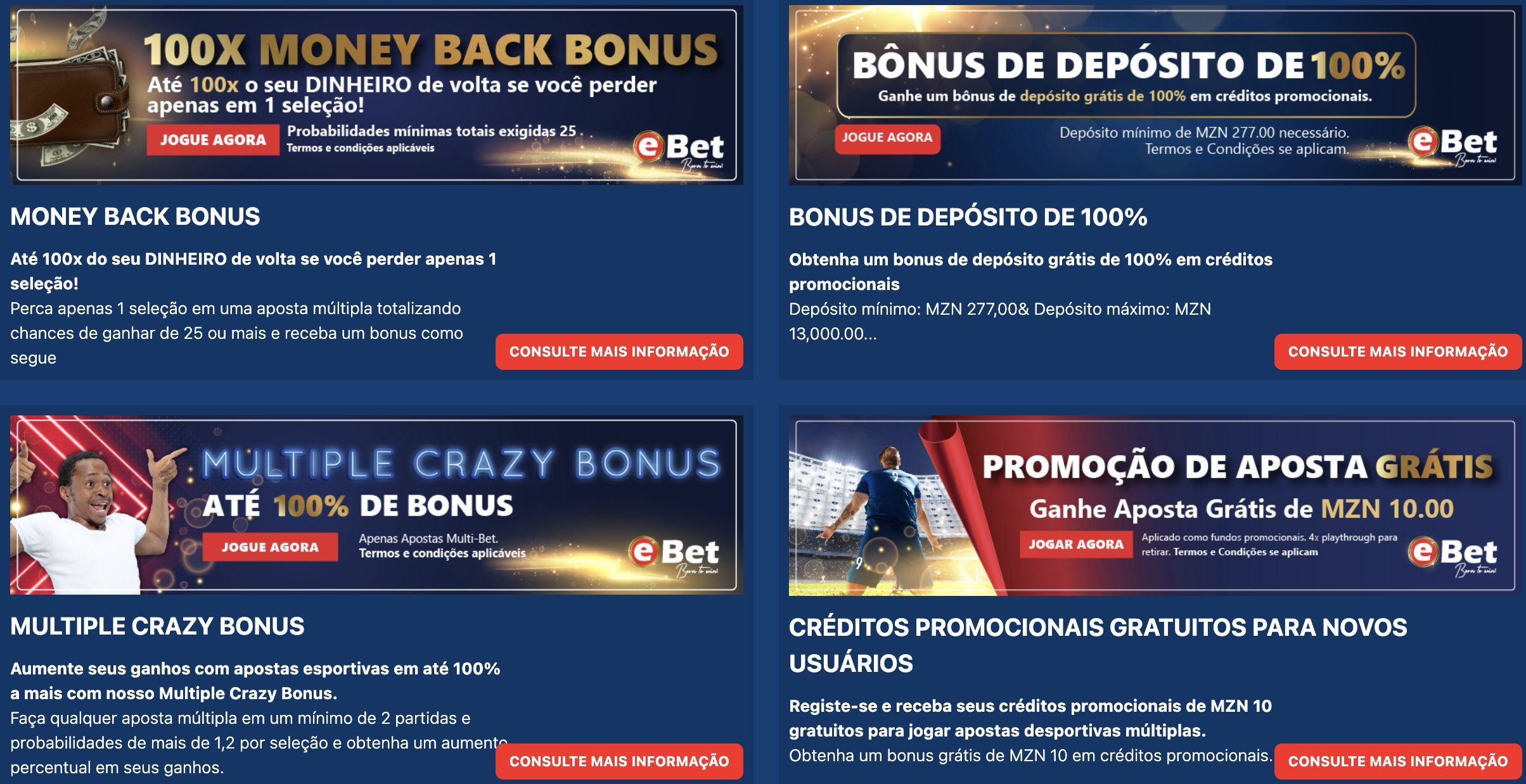 Depois de visitar os vários sites de várias casas de apostas, é difícil não fazer uma comparação entre elas, pois há coisas que me agradam que eu gostaria que tivessem em todas as casas de apostas que já visitei e que ainda vou visitar. Pessoalmente, achei o programa de bónus da eBet muitíssimo fraco, podia ser melhor. Não digo isso por só nos serem apresentadas quatro opções de bónus, mas, os bónus, em si, são fracos. Embora sejam fracos, são os mesmos que encontramos na maioria das casas. Quanto aos bónus em si, o destaque vai para o bónus de boas-vindas. Não é muito comum encontrarmos um bónus de boas-vindas propriamente dito. Pois, muitas das vezes, eles estão associados ao seu primeiro depósito. Mas aqui, na eBet, as coisas são diferentes. A eBet oferece 10 MT ao fazer o registo, um bónus que só é válido nas apostas de futebol. Pode não ser muito, mas acredito que seja suficiente para fazer as suas apostas e ganhar na eBet. É um facto que poderia ser melhor, mas está bom como está.