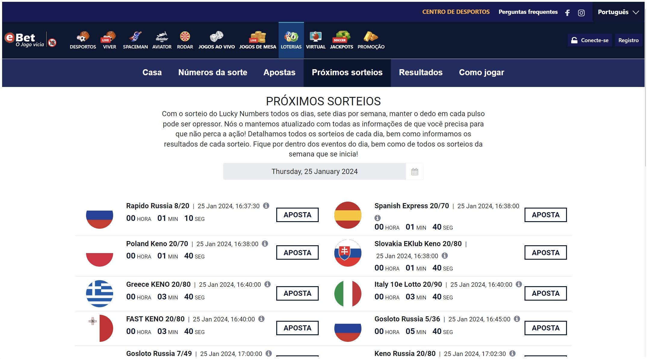 Os jogos de loteria não são muito comuns em sites de casas de apostas, principalmente quando estas estão mais viradas para o ramo do desporto. A eBet oferece uma maneira diferente de jogar aos números da sorte. Embora não tenha nenhum jogo de loteria nacional, a eBet permite participar de jogos de loteria de todo o mundo a partir da sua casa e do seu país de origem. Como é tudo feito de forma online, não precisa viajar até o país onde apostou para levantar os seus ganhos, pois terá os seus ganhos creditados na sua conta.
