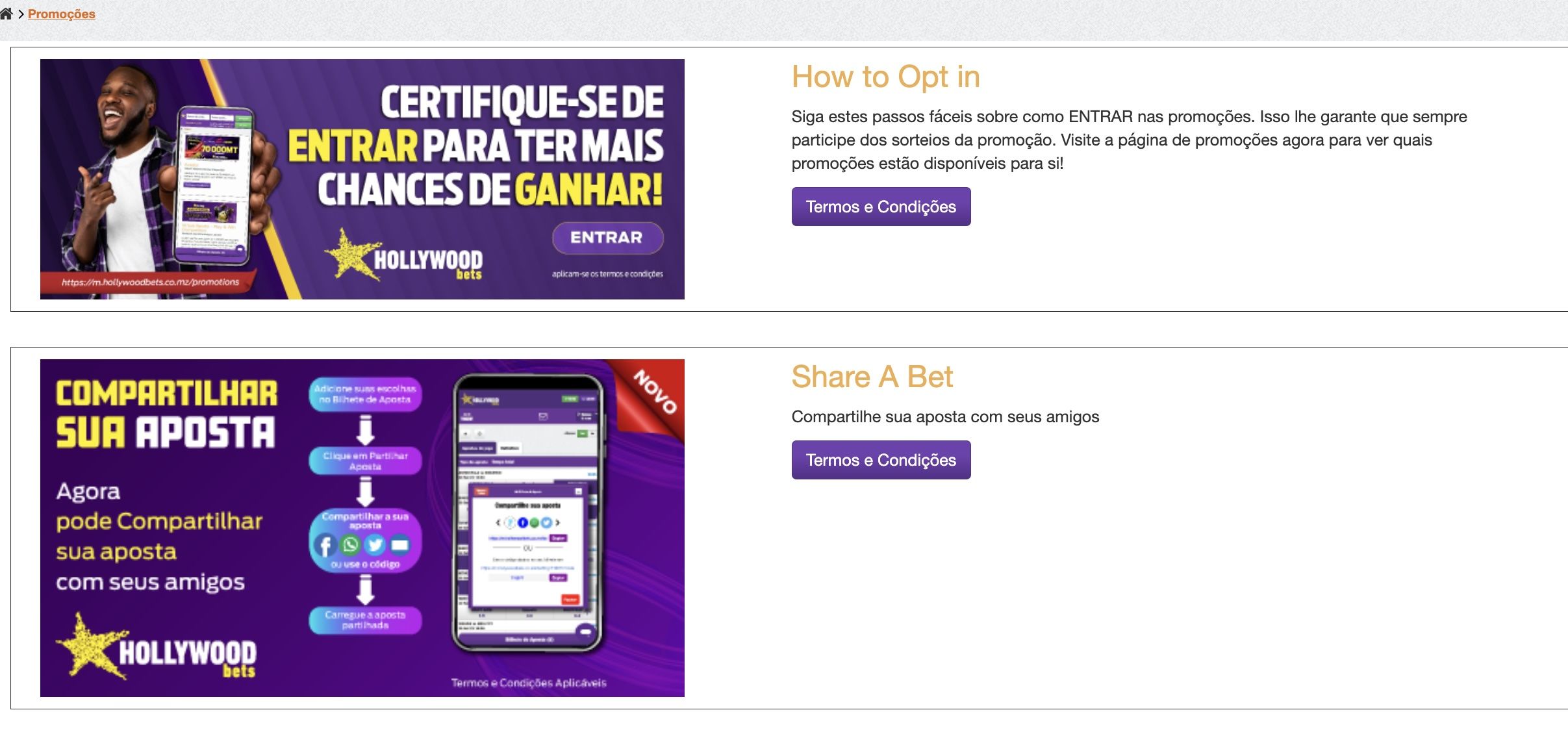 No site da Hollywoodbets é possível encontrarem-se vários tipos de bónus: Desde Referir um Amigo, Dinheiro de Volta e Recargas Grátis. Não existe nenhum bónus de boas-vindas nesta casa de apostas. Também não existe programa de fidelidade disponível.