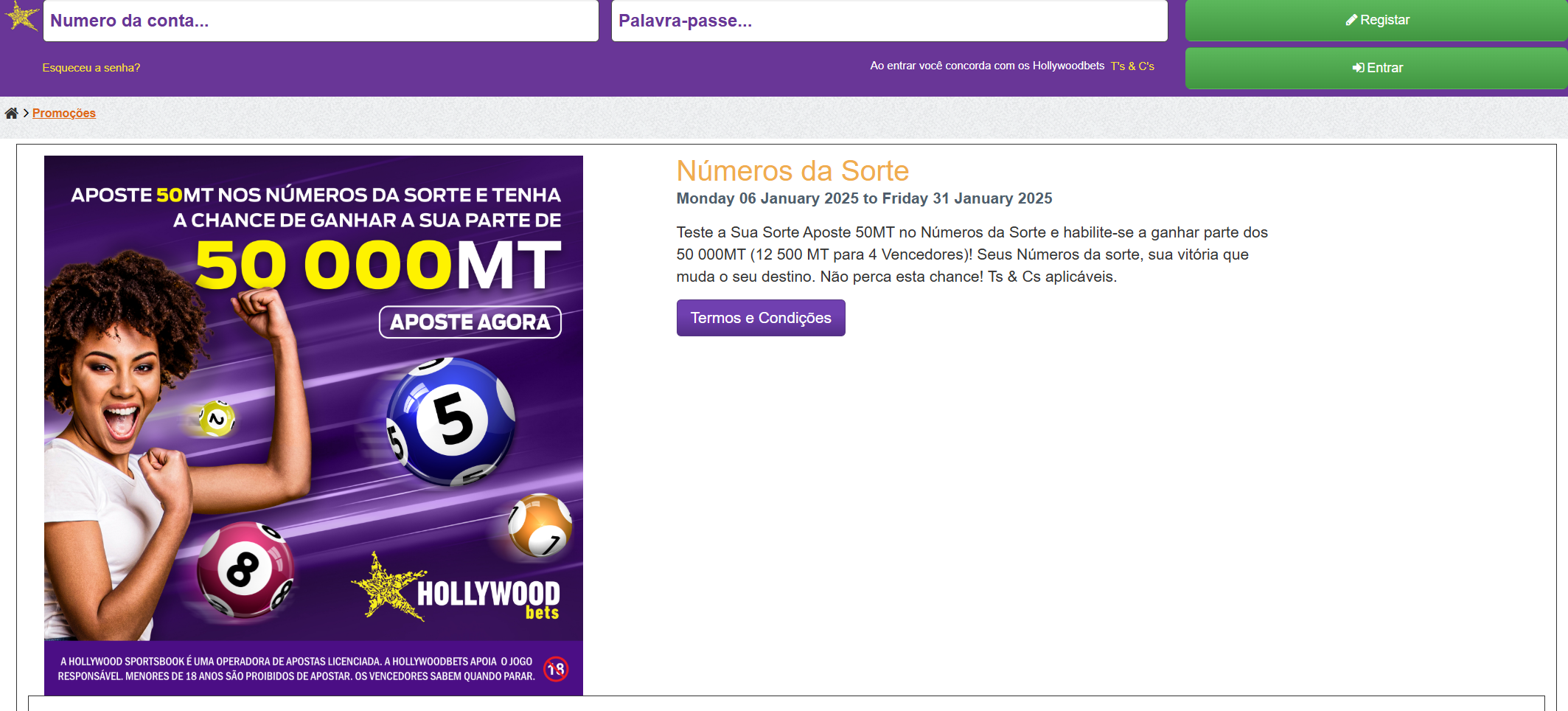 A campanha "Números da Sorte" da Hollywoodbets vai de 6 a 31 de janeiro de 2025. Aposte 50 MT ou mais para concorrer a prêmios totais de 50.000 MT, distribuídos em sorteios semanais de 12.500 MT. Os vencedores serão selecionados aleatoriamente e anunciados nas redes sociais. As entradas são ilimitadas, mas não é permitido ganhar mais de uma vez. Prêmios não transferíveis e depósito nas contas Hollywoodbets dos vencedores.