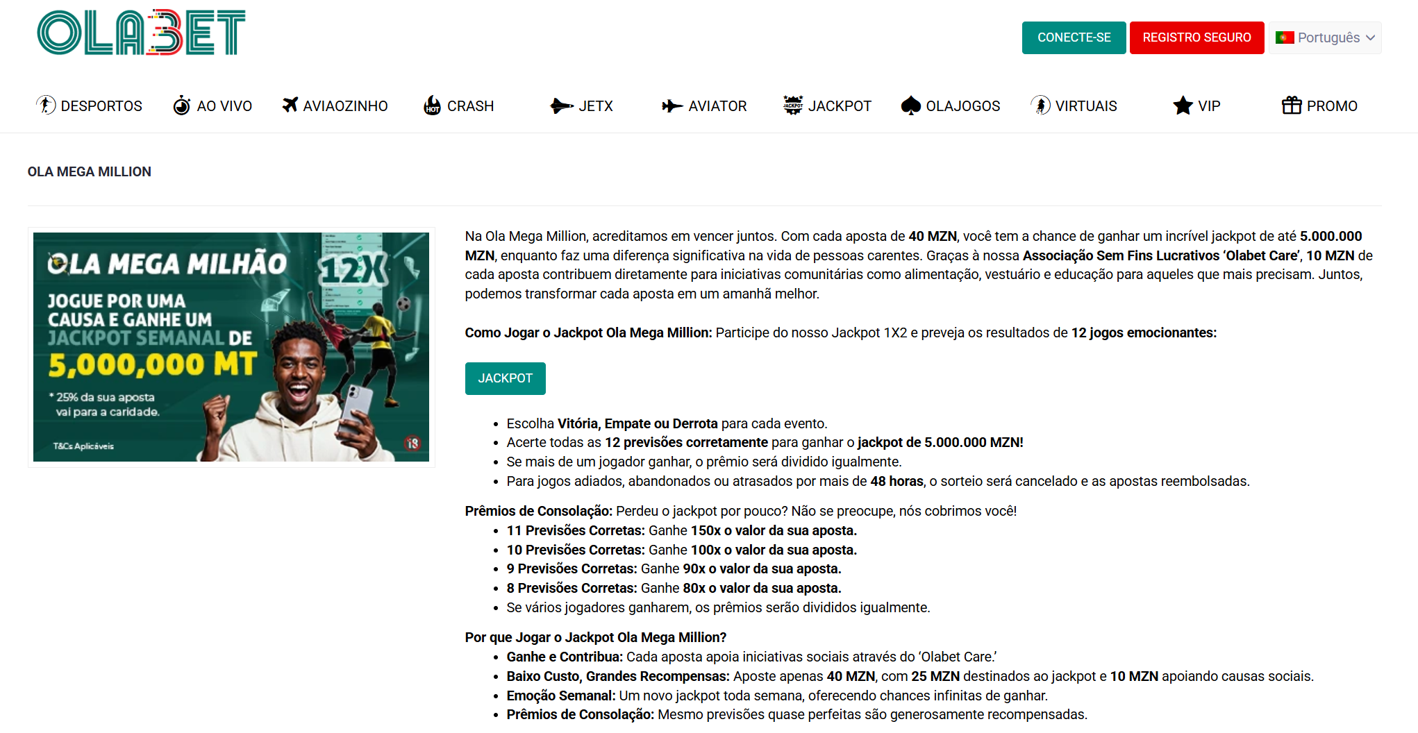 Participe do Jackpot Ola Mega Million! Aposte 40 MZN e tenha a chance de ganhar até 5.000.000 MZN, enquanto apoia causas sociais. Com cada aposta, 10 MZN vão para a ‘Olabet Care’, ajudando com alimentação, vestuário e educação. Acerte as 12 previsões corretas e ganhe o prêmio principal. Apostas de 40 MZN também oferecem prêmios de consolação generosos. Jogue toda semana e faça a diferença!