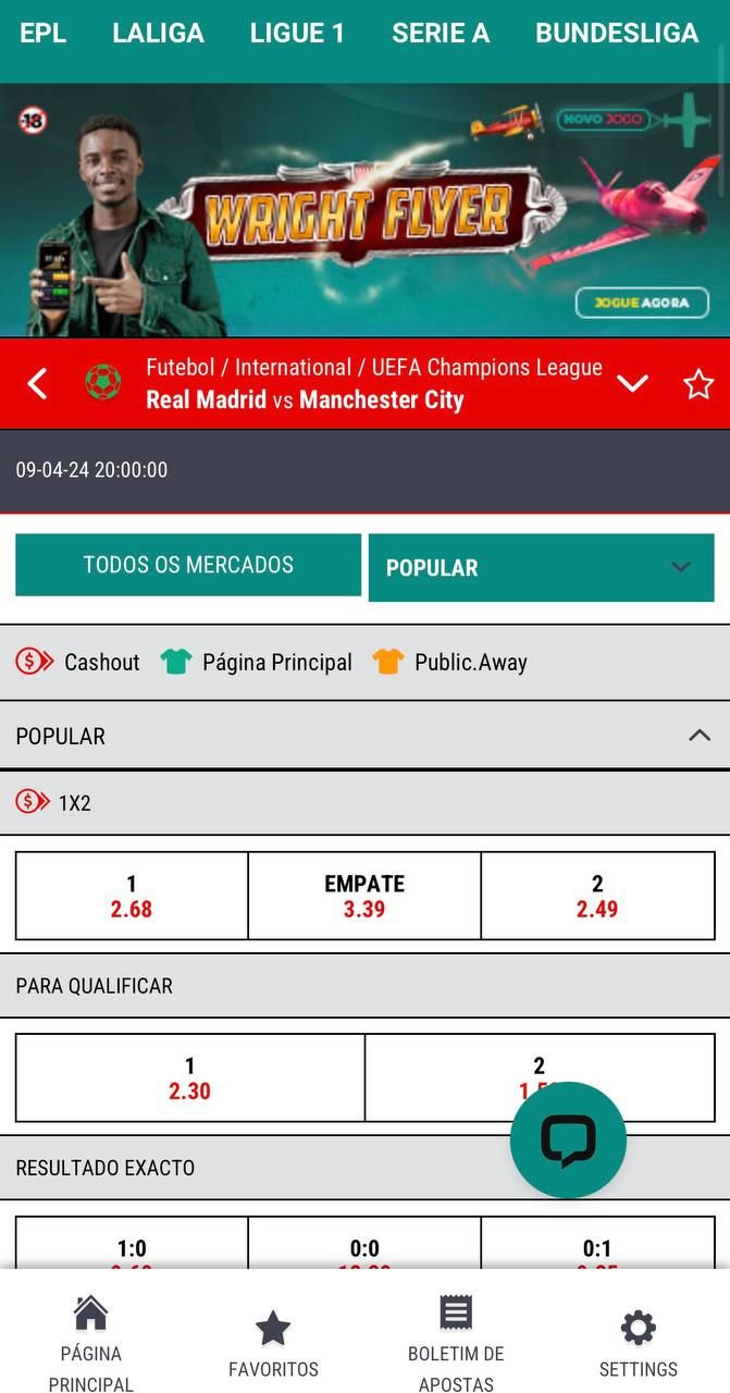 Começando pelo que considero positivo: o visual do site é realmente bom. Visualizar os jogos disponíveis, os jogos destaque do dia — há até mesmo uma aba separando as principais ligas europeias. Os menus são de fácil navegação, tanto no mobile quanto no PC e há um botão de chat que leva diretamente para o canal de suporte ao cliente, outro ponto que considero positivo.