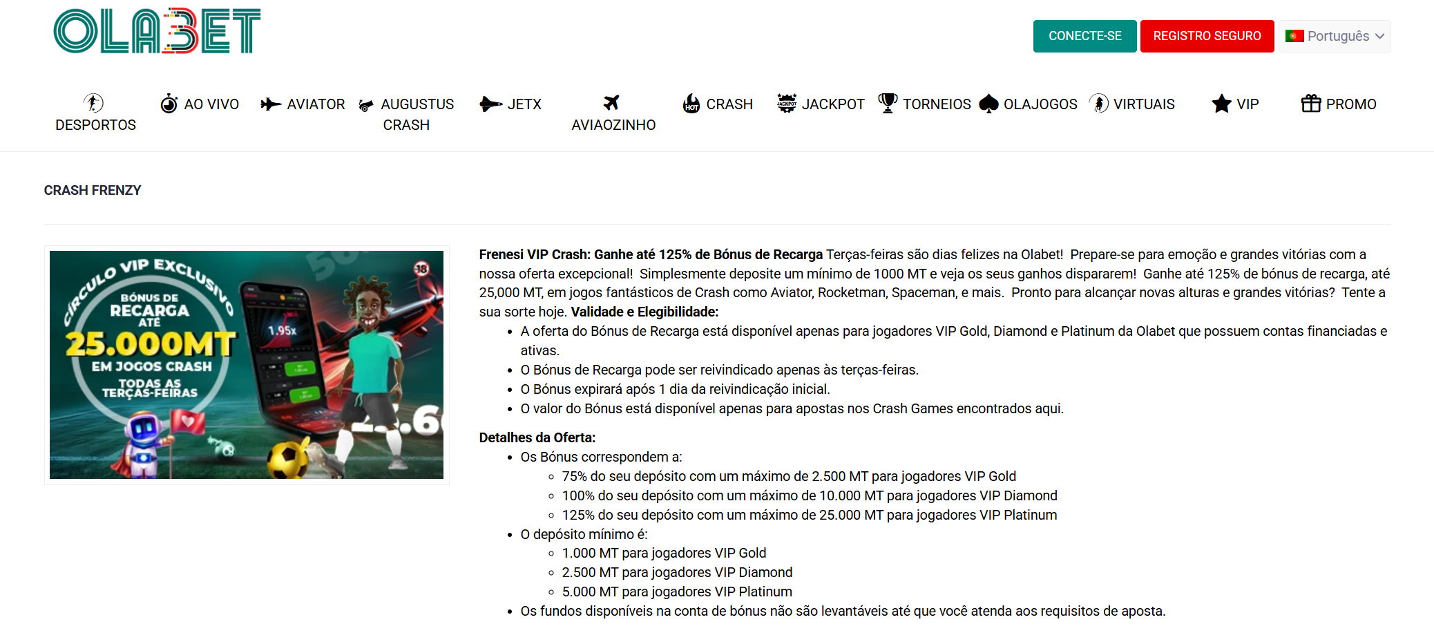 Na Olabet, todas as terças-feiras são especiais! Deposite a partir de 1.000 MT e ganhe até 125% de bónus de recarga, até 25.000 MT, nos jogos Crash como Aviator e Rocketman. A oferta está disponível apenas para jogadores VIP Gold, Diamond e Platinum. Os bónus são válidos por 1 dia e exigem apostas de 50x antes de poderem ser levantados. Aproveite esta oportunidade e aumente suas vitórias!