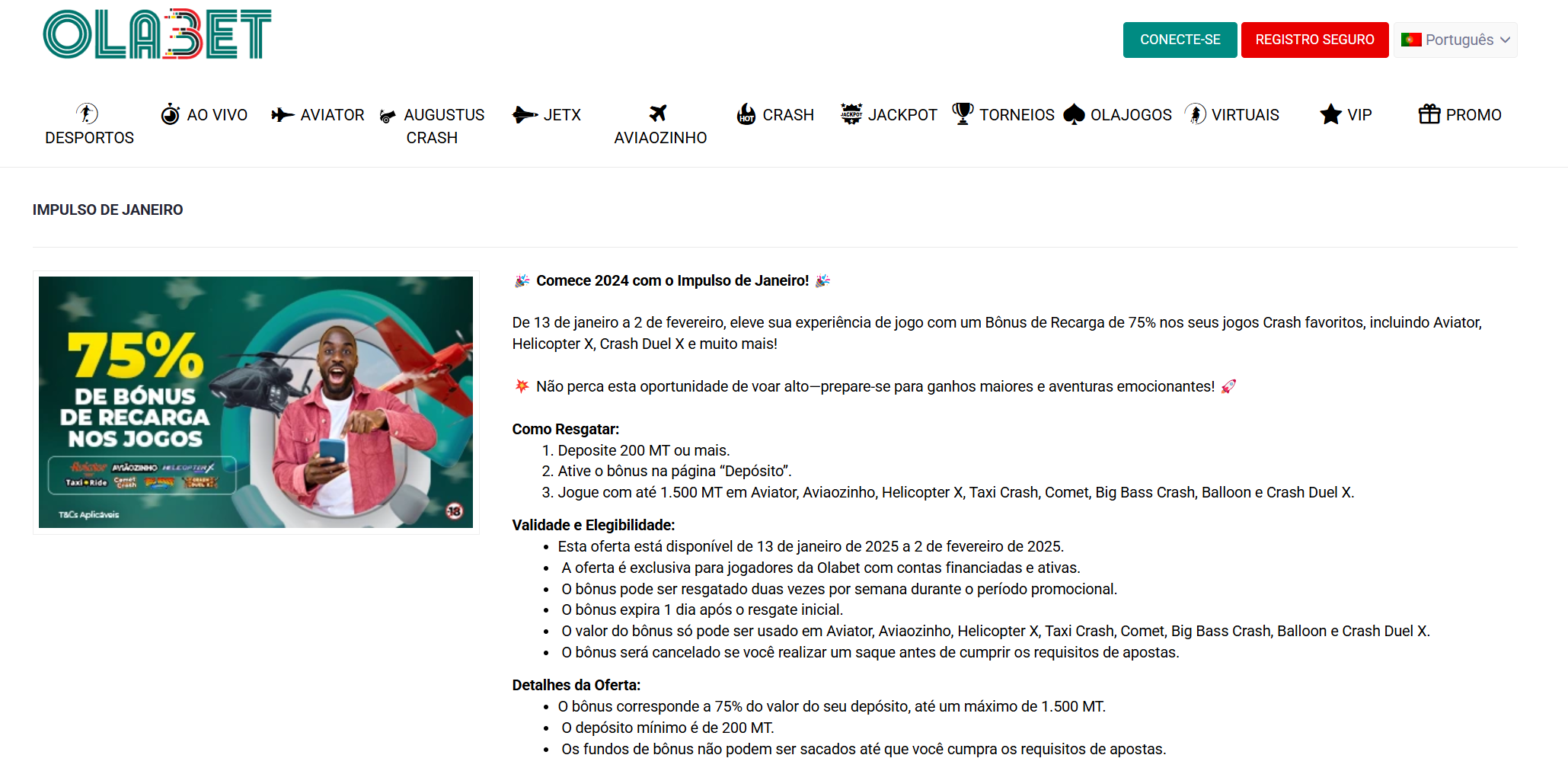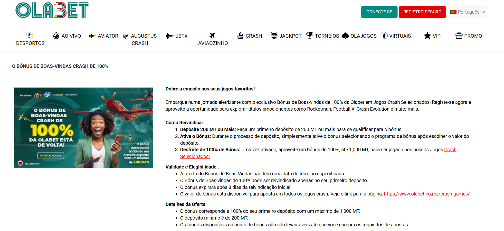 Registe-se na Olabet e aproveite o Bónus de Boas-vindas de 100% até 1.000 MT em Jogos Crash como Rocketman, Football X e Crash Evolution! Deposite 200 MT ou mais, ative o bónus durante o depósito e aposte 50 vezes antes de retirar. O bónus é válido por 3 dias.