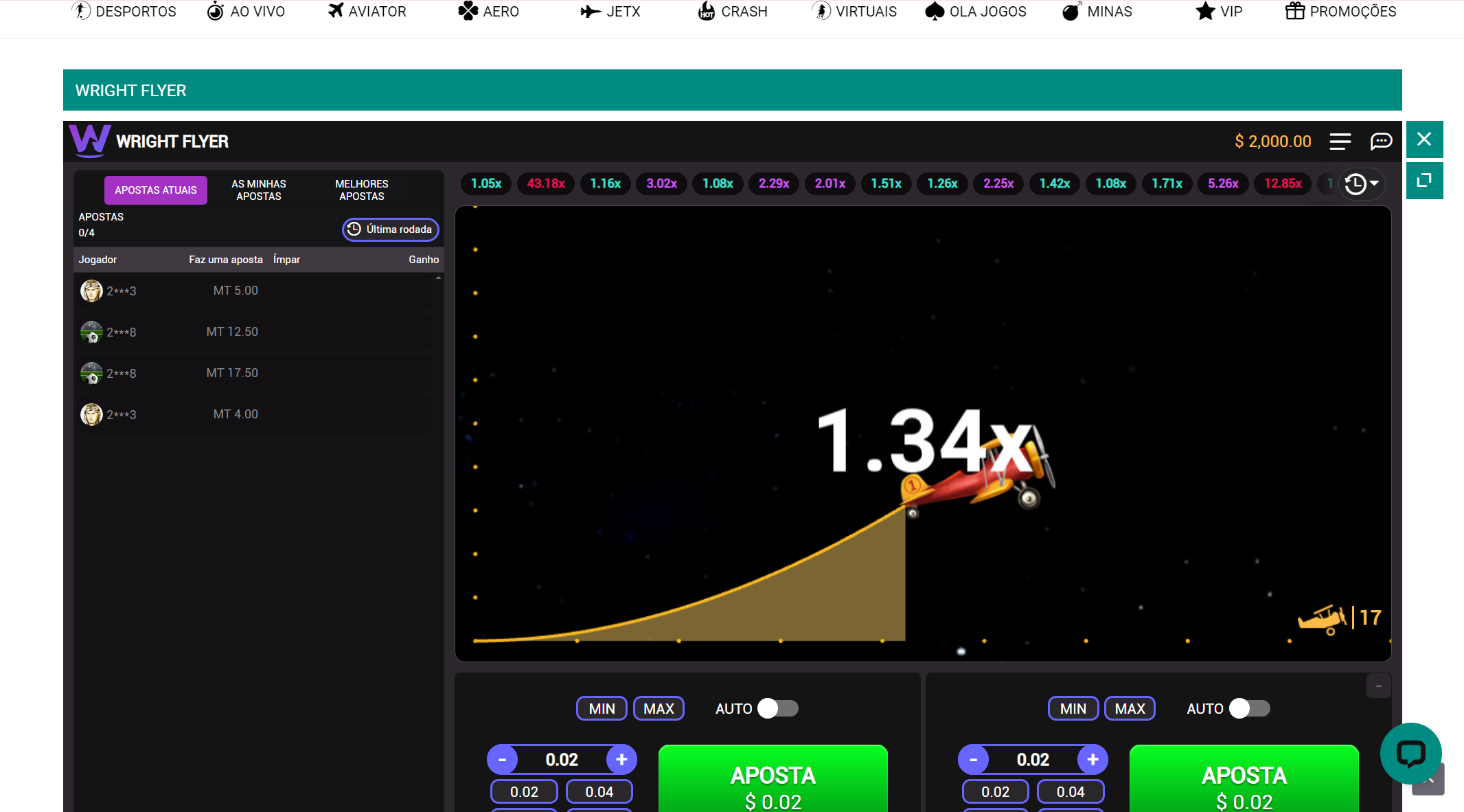 Vindo dos sites de criptomoedas, esse modo de aposta está se tornando cada vez mais querido entre os apostadores por sua simplicidade, por ser um jogo baseado na perceção do apostador, e por seus potenciais ganhos. A ideia deste jogo é acompanhar um avião descolar. Conforme o avião sobe, o multiplicador aumenta. O objetivo é fazer o cashout antes do avião desaparecer. Agora, na Olabet, um jogador pode aumentar as suas hipóteses de ganhar com um bónus de recarga de 100% no Aviator. O bónus pode ser utilizado duas vezes por semana. Neste artigo, pode se aprofundar nos detalhes deste jogo.