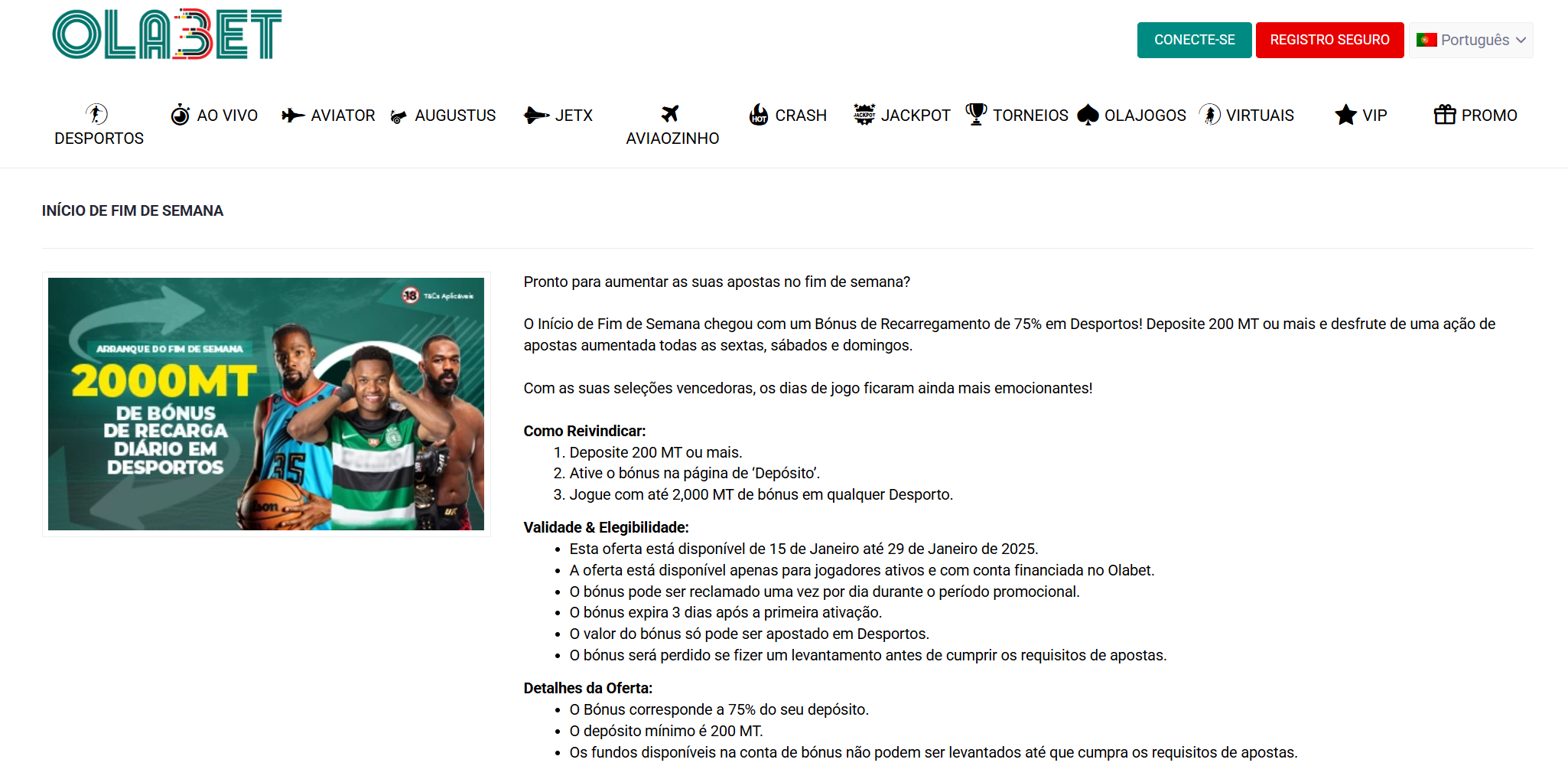 Aproveite o Bónus de Recarregamento de 75% para Desportos no Fim de Semana! Deposite 200 MT ou mais e receba até 2.000 MT em bónus para apostar nas sextas, sábados e domingos. A oferta é válida até 29 de Janeiro de 2025 e pode ser ativada uma vez por dia. O bónus tem requisitos de apostas de 4x em odds mínimas de 20.00 e 5 seleções por bilhete.