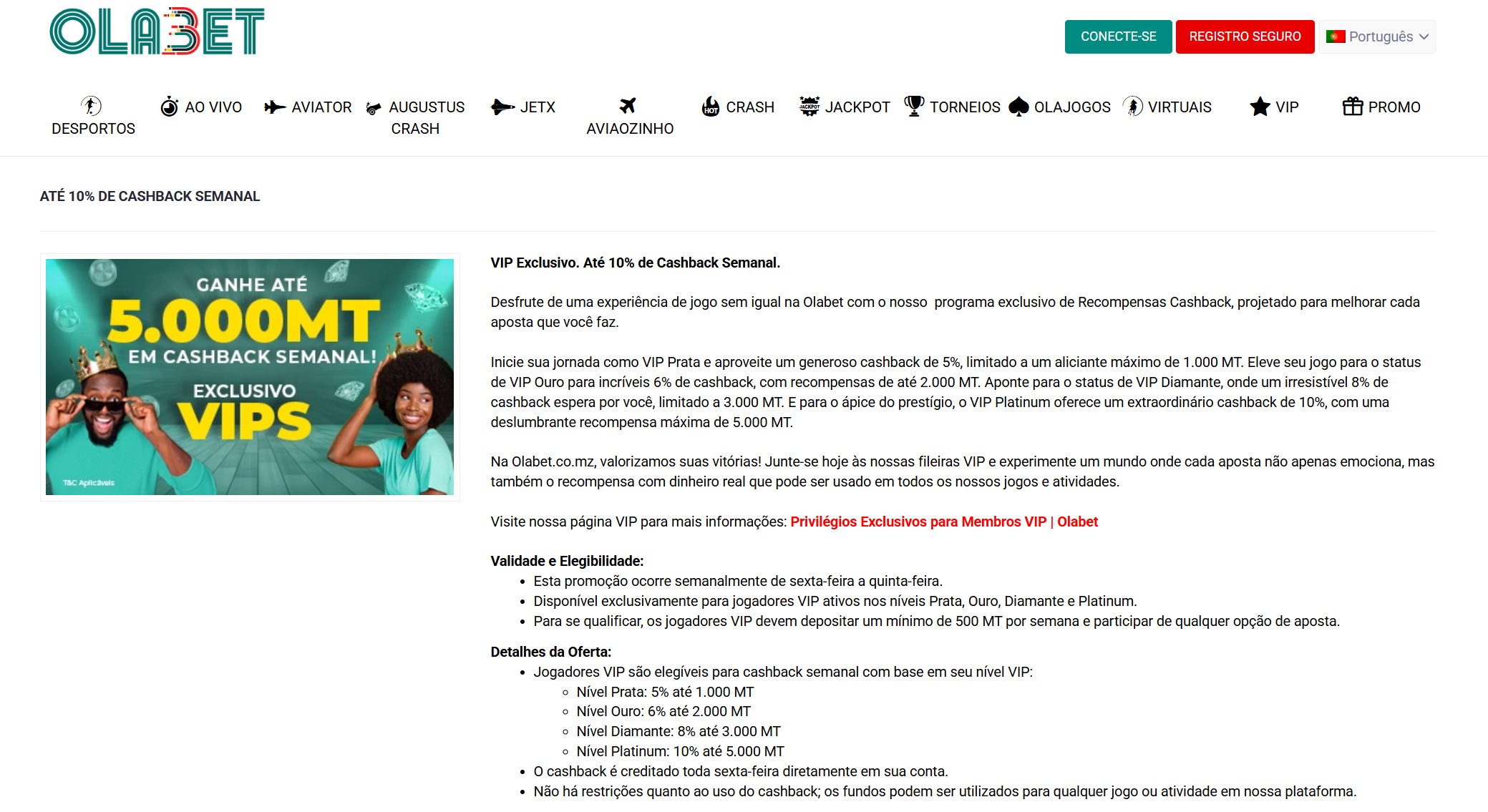 Desfrute de recompensas exclusivas na Olabet com o programa de Cashback VIP. Comece com 5% de cashback no nível Prata (até 1.000 MT) e suba para 10% no nível Platinum (até 5.000 MT). Para qualificar, deposite no mínimo 500 MT por semana e participe de apostas. O cashback é creditado toda sexta-feira, sem requisitos de apostas. Junte-se aos nossos níveis VIP e aproveite as vantagens exclusivas.