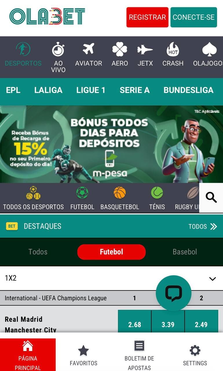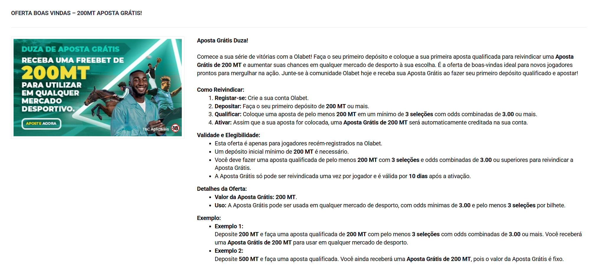 Aposte e ganhe uma Aposta Grátis de 200 MT na Olabet! Faça seu primeiro depósito de 200 MT ou mais e coloque uma aposta qualificada com 3 seleções e odds combinadas de 3.00 ou mais. Após isso, receba sua Aposta Grátis para usar em qualquer mercado de desporto. A oferta é válida por 10 dias e pode ser utilizada uma vez por jogador. Ganhos da Aposta Grátis são creditados em sua conta real.