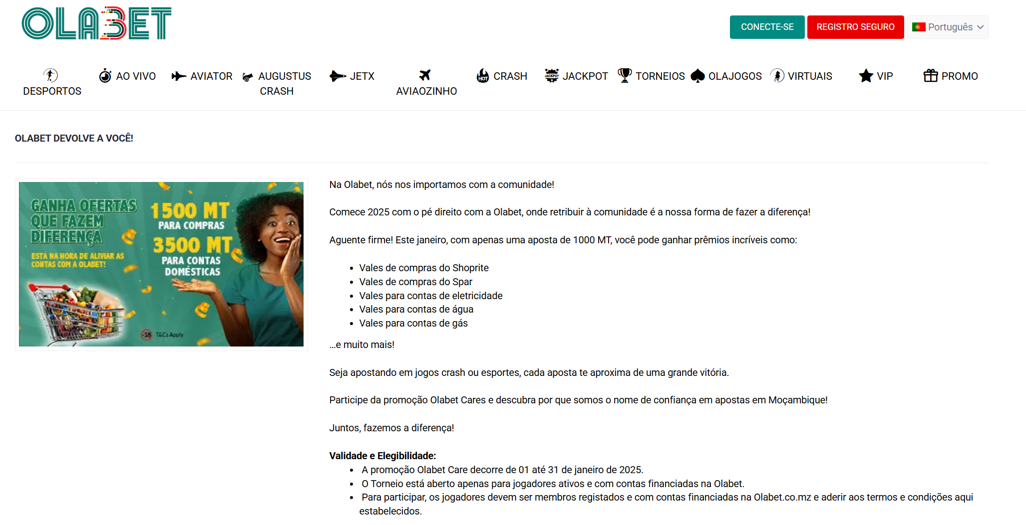 Em janeiro, aposte 1.000 MT na Olabet e ganhe prêmios incríveis como vales de compras (Shoprite, Spar) e vales para contas de eletricidade, água e gás! Cada aposta em jogos crash ou esportes te dá bilhetes para a promoção Olabet Cares. A promoção vai até 31 de janeiro e os vencedores serão anunciados em 3 de fevereiro de 2025. Participe e faça a diferença!