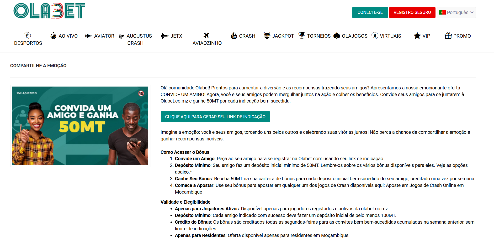 Convidem os vossos amigos para se juntarem à Olabet e ganhem 50MT por cada indicação bem-sucedida. Basta o amigo registar-se e fazer um depósito mínimo de 50MT. O bónus será creditado semanalmente na vossa carteira, podendo ser usado para apostar nos jogos de Crash. A oferta é exclusiva para residentes em Moçambique e tem requisitos de apostas. Aproveitem!