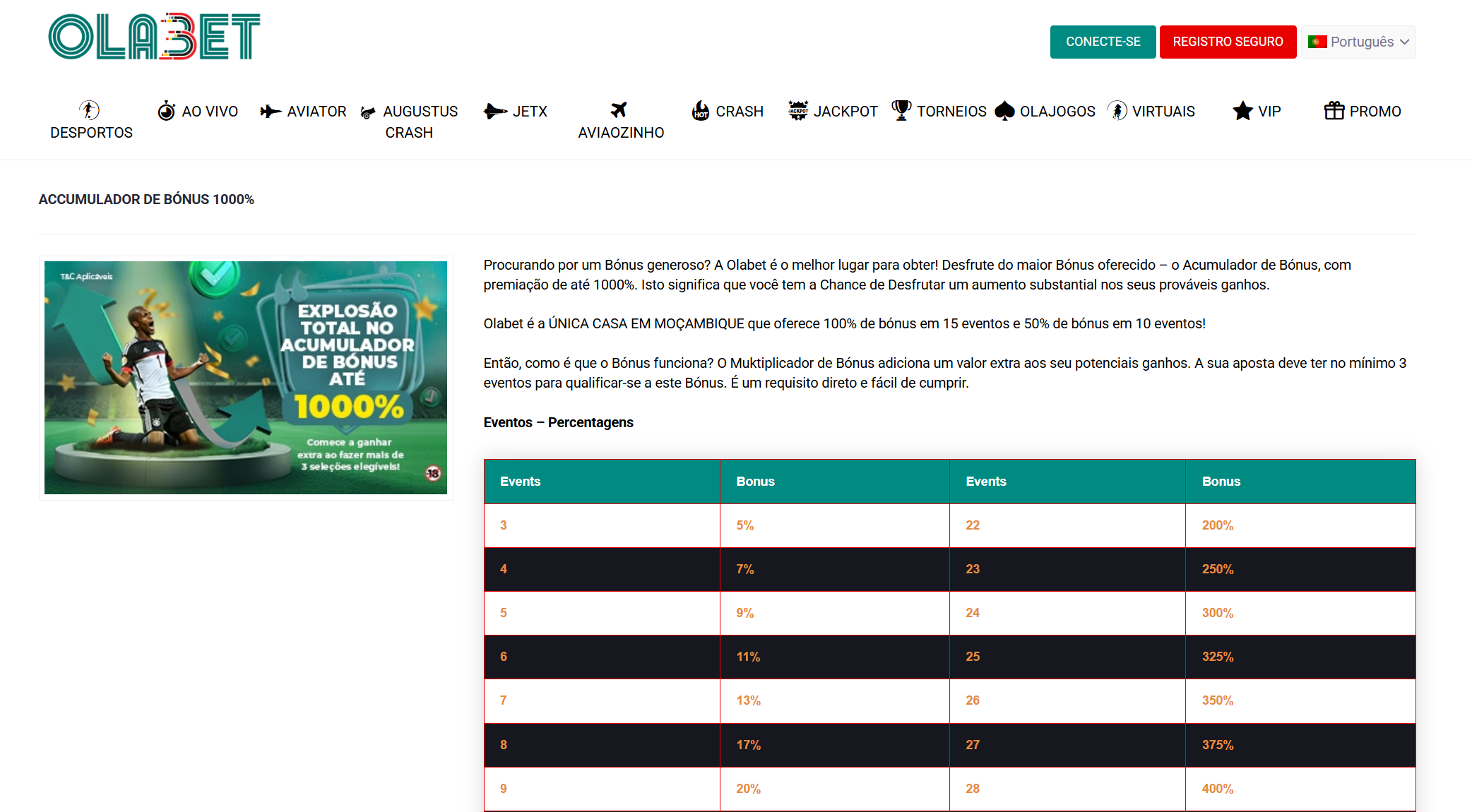 A Olabet é a ÚNICA em Moçambique a oferecer 100% de bónus em 15 eventos e 50% em 10!