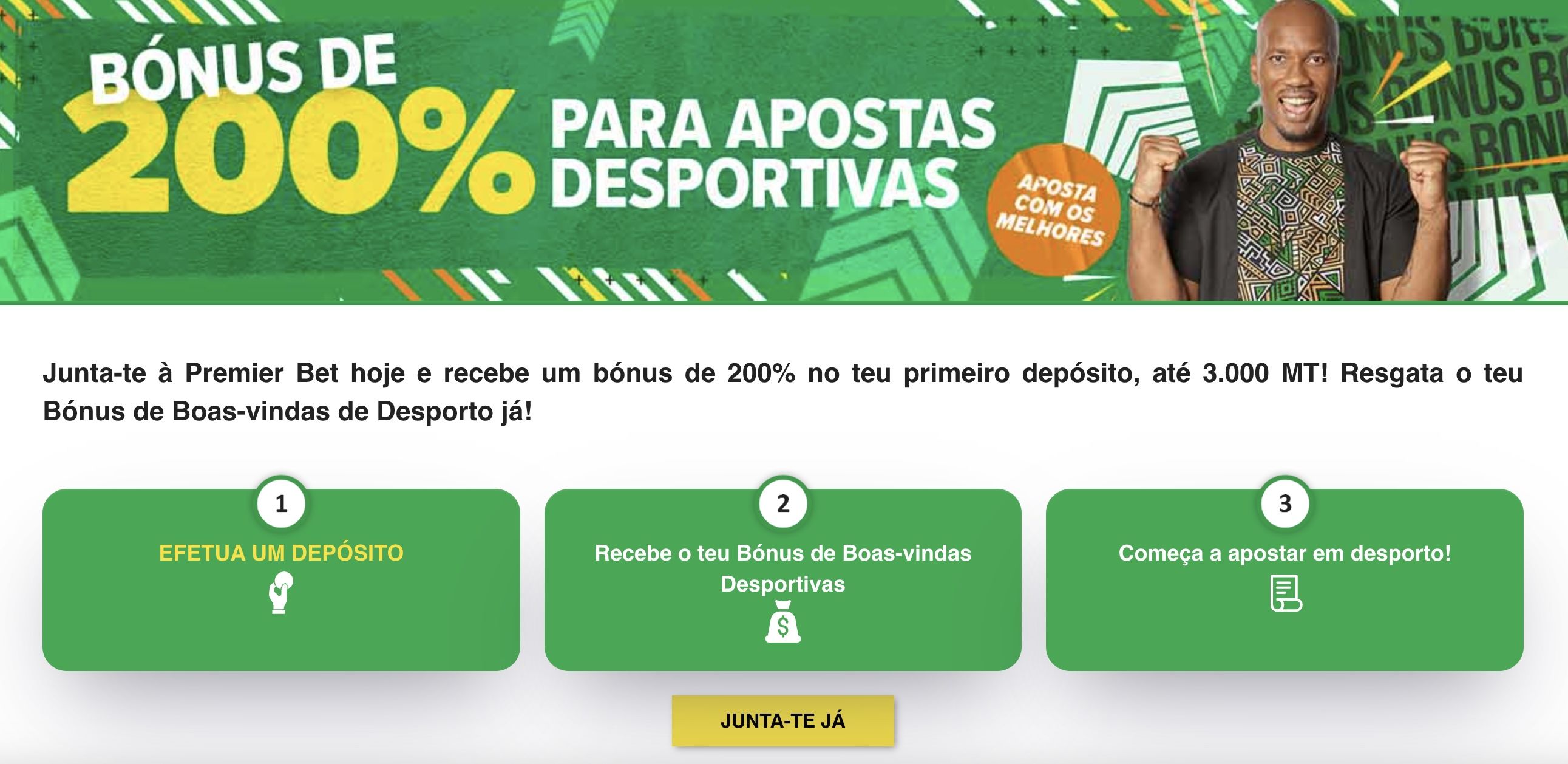 A Premier Bet oferece um bónus de boas vindas em 200%. Portanto, os novos apostadores triplicam o seu depósito inicial em apostas desportivas. Se os novos utilizadores depositarem pelo menos 65 MT recebem uma aposta grátis de 13 MT nos primeiros cinco dias. O valor máximo de bónus é de 3.000 MT. Consulte a plataforma Premier Bet para conferir os detalhes desta oferta.