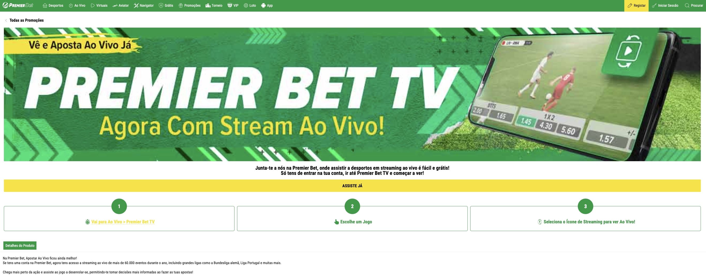 Caso queira, poderá fazer apostas ao vivo em vários desportos e também ter a oportunidade de ver a transmissão em direto. Dessa forma, poderá assistir aos jogos e acompanhar as suas apostas com mais emoção. A Premier Bet TV disponibiliza a transmissão ao vivo de desportos como futebol, ténis, basquetebol, entre outros. Terá que estar registado na Premier Bet para poder usufruir desta funcionalidade. Na plataforma tem todos os pormenores sobre como assistir à Premier Bet TV.