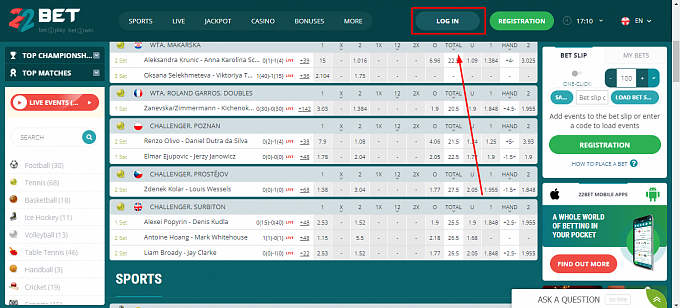 Go to the 22Bet website and click on the 22Bet login button in the upper right hand of the page.