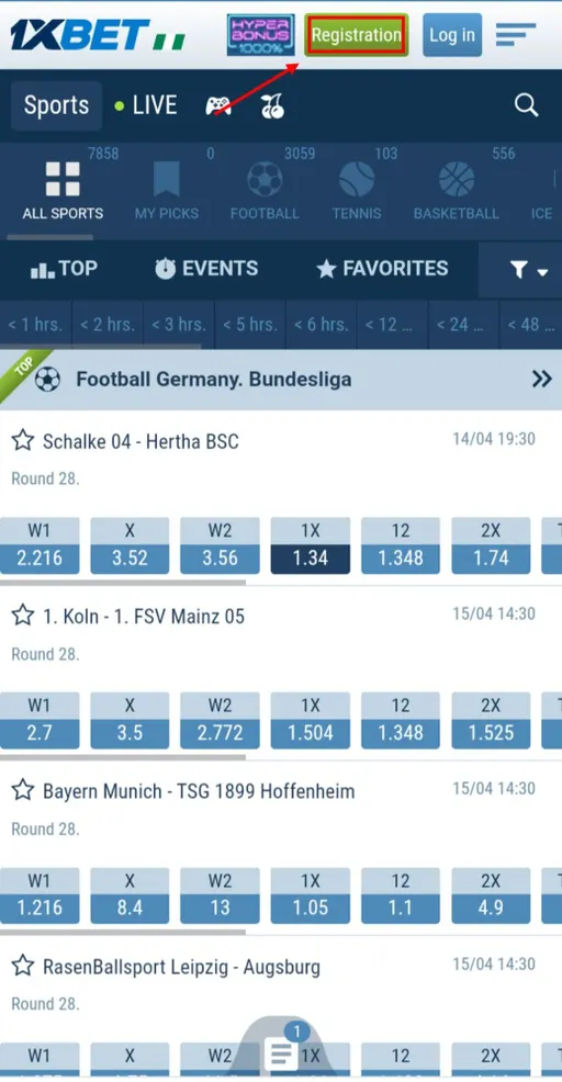 - Visit 1xBet website, and on the homepage, click the REGISTRATION button;