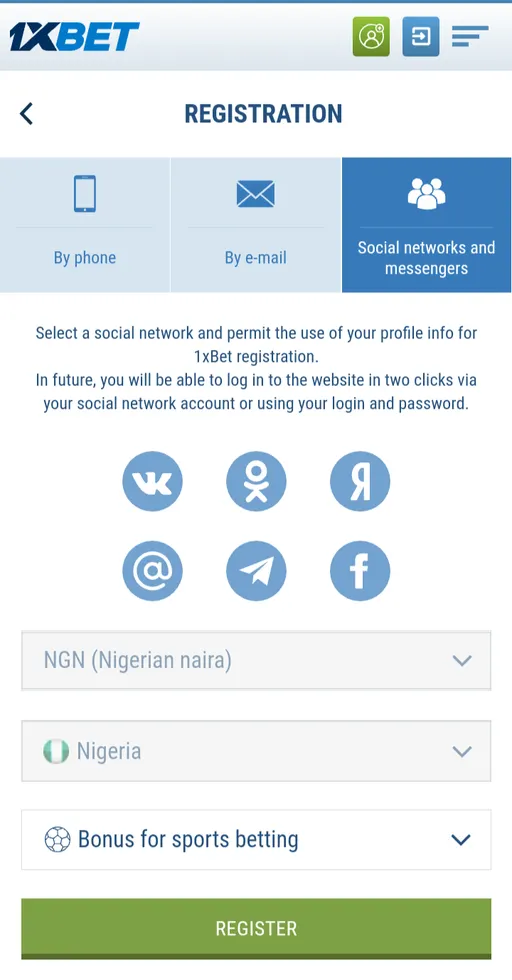 There are multiple methods of registration on 1xBet after you click the REGISTRATION button on the homepage: by phone, by email and by social networks/messengers. Here’s how to register using each one: