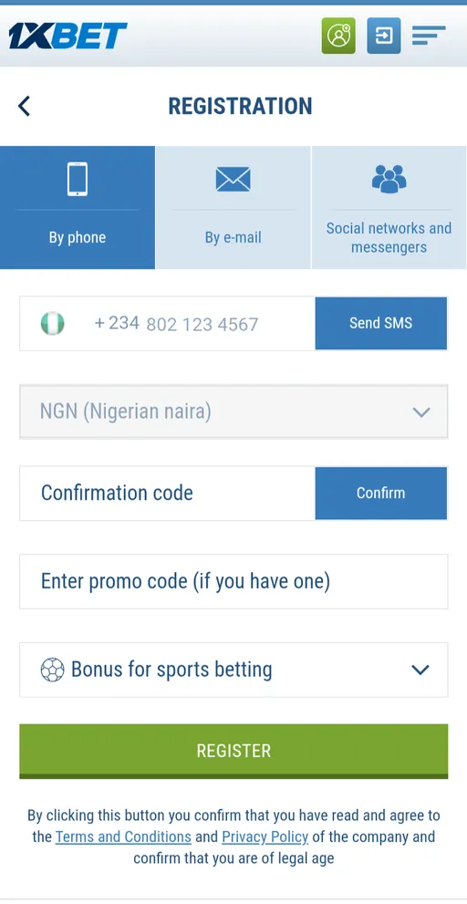 - Once the code is confirmed with a ‘green check,’ click the REGISTER button to complete for 1xBet registration by phone number Nigeria process.