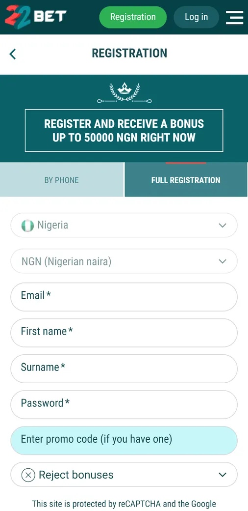 There are two ways to go about 22Bet register: either by phone or by filling out the entire registration form. To register, you'll need to visit the platform's website and click the "registration" button in the upper right corner. If you decide to register over the phone, include your Nigerian phone number and the verification code you get. On the website, Nigerian Naira is the sole currency option. Complete 22Bet sign-up necessitates submitting both your personal information and email address.