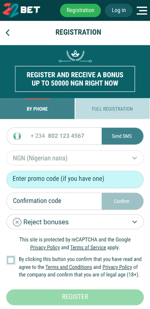 22Bet Nigeria lets you sign up with your phone number. It's a breeze and takes no time at all. To sign up with 22Bet using your phone number, follow these simple steps: