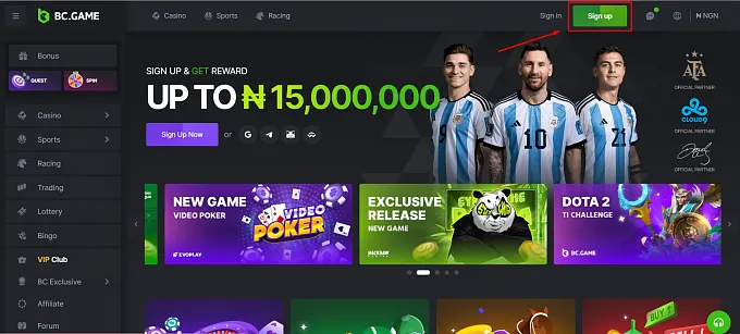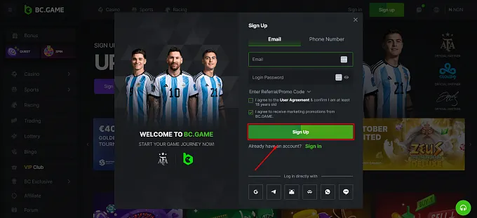Visit Bc.Game website and click the SIGN IN button at the top right side of the homepage.