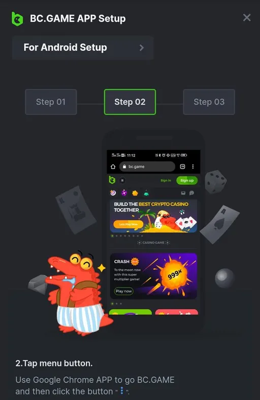 - Go to the official Bc.Game website from your Chrome browser using your Android phone;