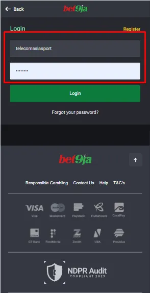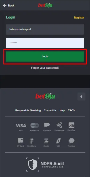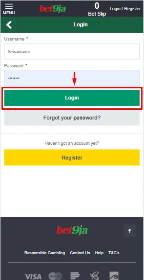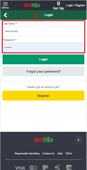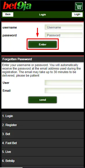 - To finalize the Bet9ja old mobile log in, input the username and password you used during account registration.