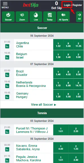 - After the homepage displays, you will find the Register button on the left and the Bet9ja login mobile button in the top right corner. Click the Login button;