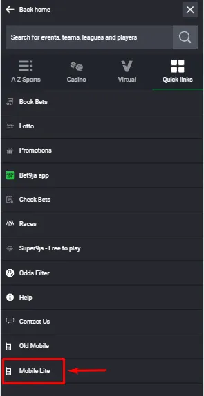 If you use an older phone, just input shop Bet9ja old mobile lite as keywords in the search engine of any web browser. However, to access this variant from the official website then, do these.