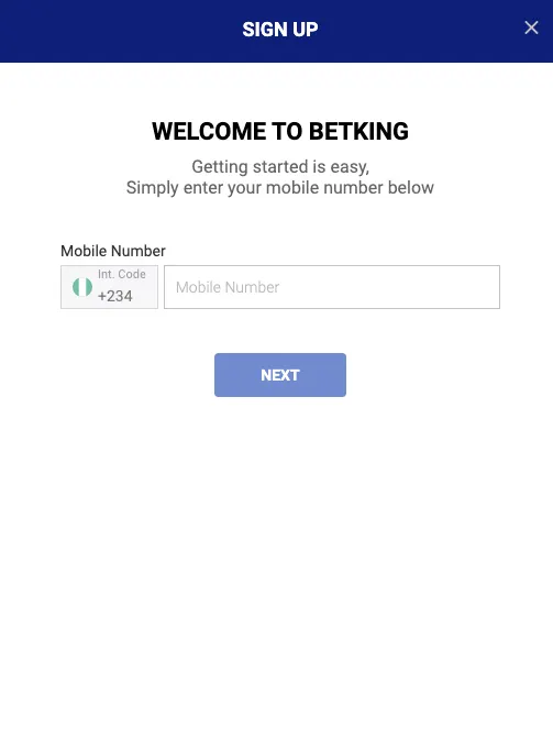 - Visit the Betking website and click on the Join Now Button, located on the top right of the website. It will take you to the next screen where you will be required to add your mobile phone number before clicking on the next button;