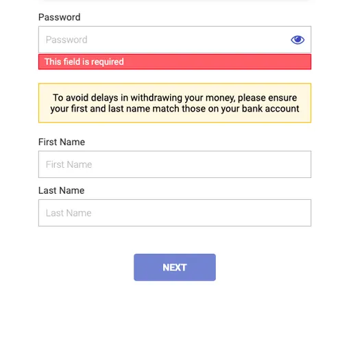 - Now you need to enter the password and the name credentials on the next screen. Make sure that you select a strong password that is a mix of characters, numbers, and special characters. Once entered, the same password will be used to log in to the website along with the username;