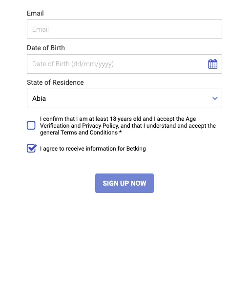 - Now enter the remaining details like the e-mail id, date of birth, and state of residence. A sign up mail will be sent to your email, for profile verification from Betking. Make sure you confirm you are 18 years or more, by ticking the age verification box, on your eligibilty in engaging in online sports betting;