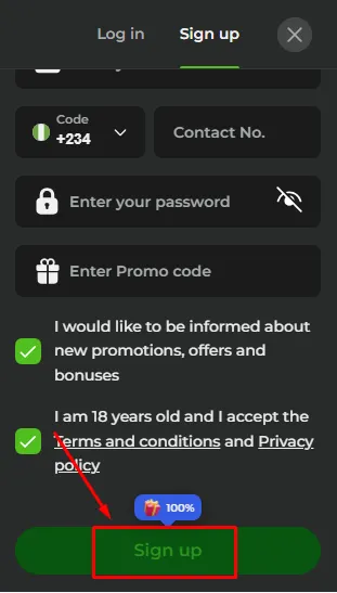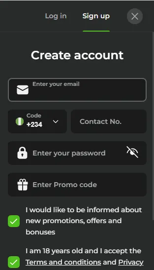 Enter required information, e.g. email, mobile phone number, password, promo code (if available), accept T&Cs.