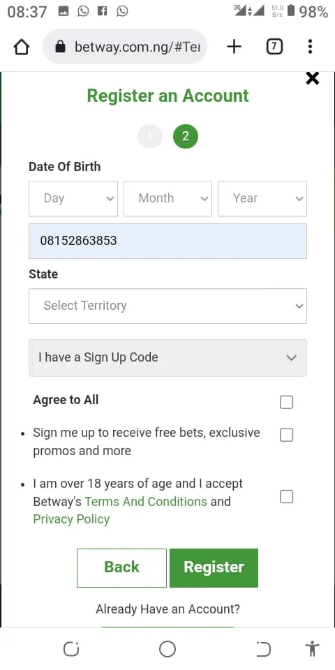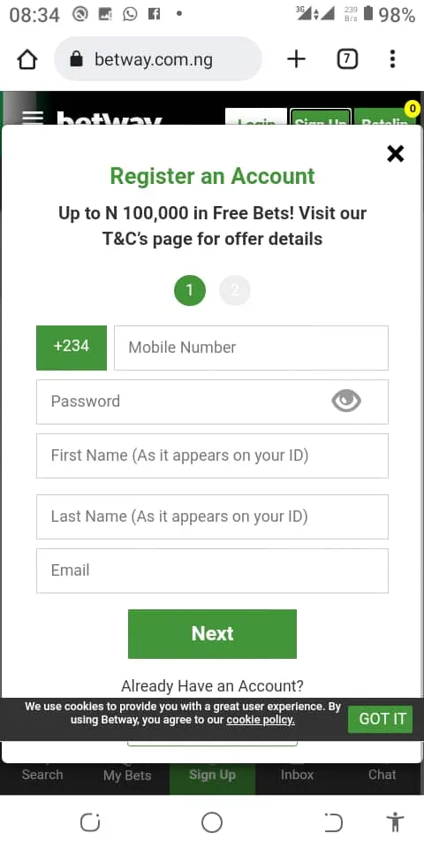 The Betway online sportsbook is a trusted fast-rising sportsbook in Africa; this makes it a preferred platform for users in that region. To join the host of Betway online users across Africa, users must ensure that they have attained or surpassed the legal betting age as required by the bookmaker, then ensure to have a smart device, and then follow the simple steps below to have the Betway register done and dusted: