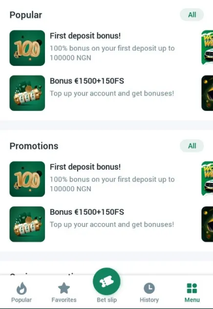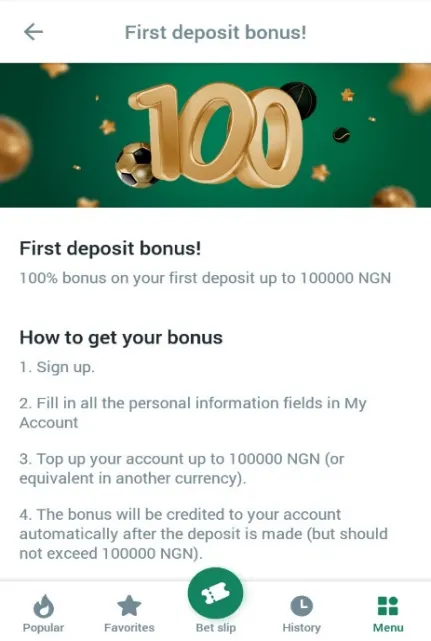 The Betwinner mobile app does not have a download bonus. However, it has a welcome bonus for new bettors, it allows new bettors to have an 100% bonus on first time deposits of up to 100,000 Naira.