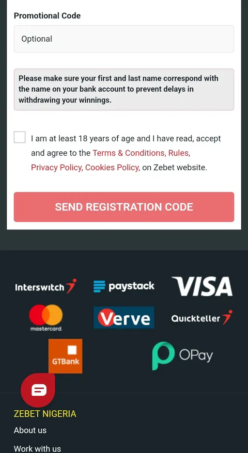 - Enter your username, full name, phone number, email, password, set currency, Zebet booking code (if available) and SEND REGISTRATION CODE;
