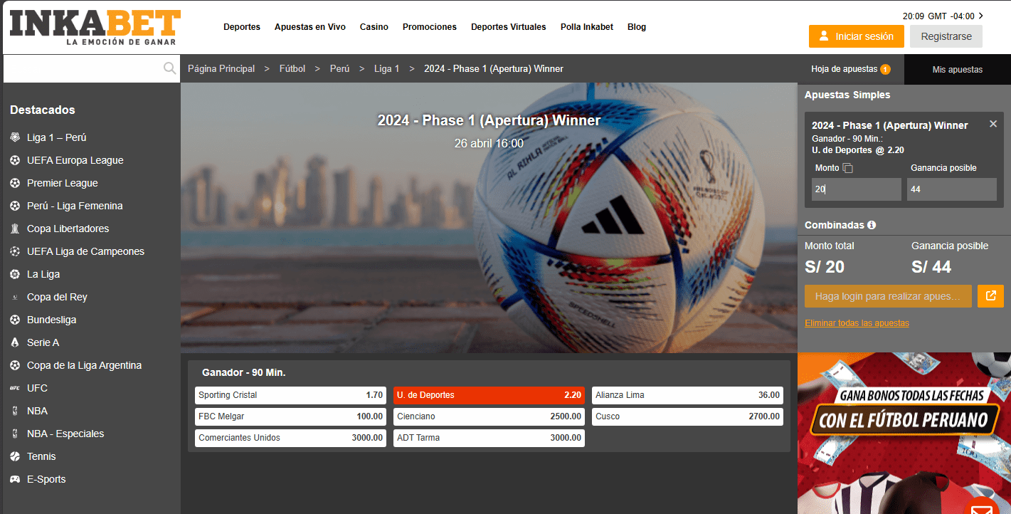 Inkabet presenta cuotas decentes en comparación con otras casas de apuesta de la región, llegando a ofrecer eventos con cuotas provechosas que se pueden presentar de la siguiente forma: Western United FC: 2.55, Empate: 4:00, Adelaide United: 2.45.