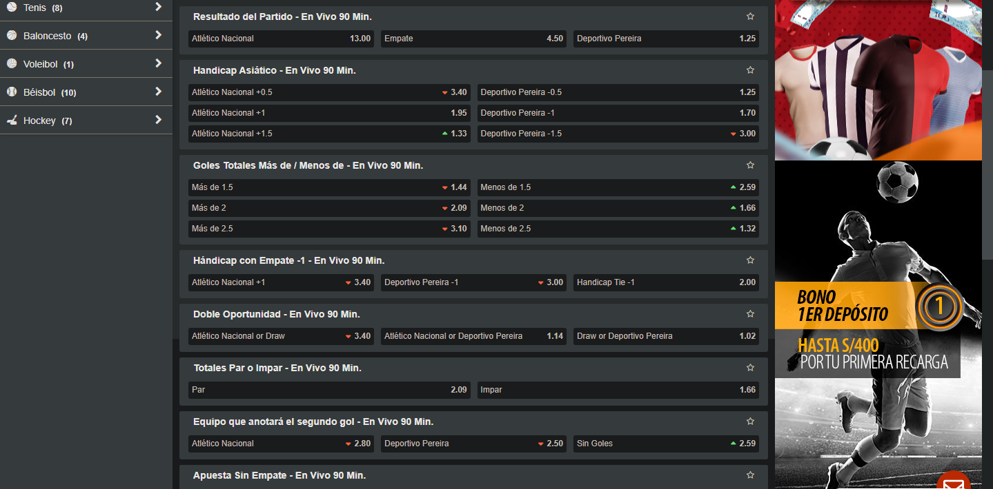 - Apuestas en: Deportes, Fútbol, Baloncesto, Béisbol, Deportes virtuales, Rugby, Tenis;