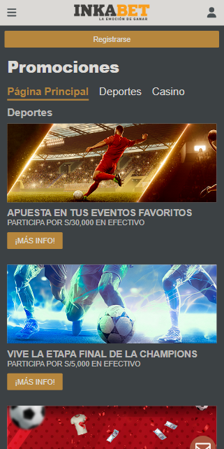 Inkabet ofrece un amplio abanico de oportunidades con ofertas y promociones que pueden mejorar la rentabilidad de tus apuestas. Desde el atractivo bono de bienvenida hasta promociones exclusivas, el sitio constantemente presenta nuevas oportunidades para aprovechar, por lo que se recomienda estar atento para no perderse ninguna nueva oportunidad que pueda surgir. Cabe mencionar que para ser partícipe de algún bono debes dar clic en el botón “Participa Aquí” al situarte dentro del apartado del bono.