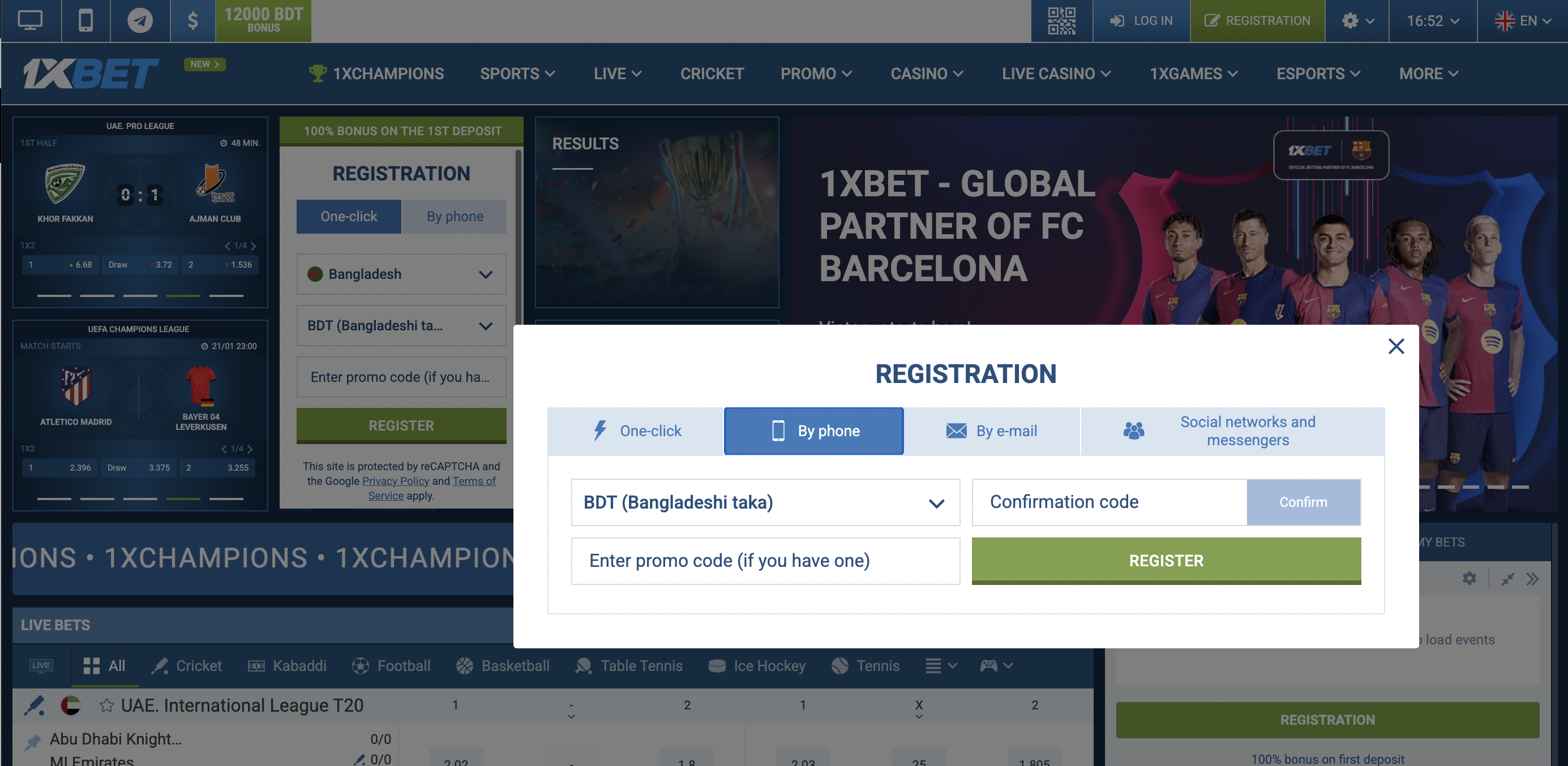 If you are located in Bangladesh, enter the promo code TELEASIA while registering an account with 1xBet to receive a 100% bonus up to 12,000 BDT. To activate the bonus code, you must be aged 18 or older. You also need to be a new player and meet the minimum deposit requirement of 120 BDT. Here is a short guide on how to register at 1xBet Bangladesh using our exclusive promo code: