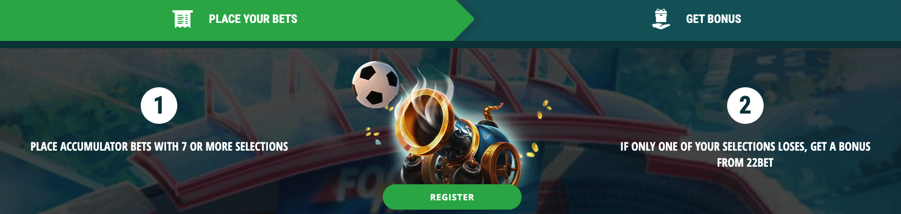 Never miss out on a big win again - 22Bet's latest promotion gives you a bonus even if you lose an accumulator bet due to just one event! Join now and turn your near-misses into major payouts.