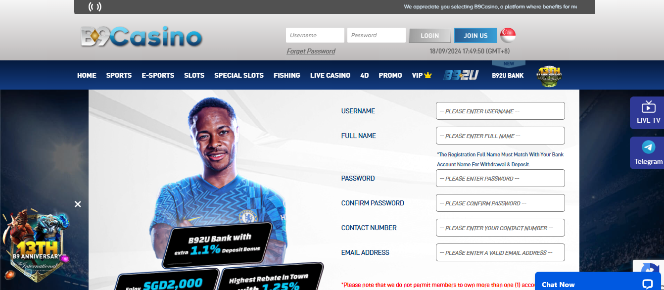 Deposit at least SGD 50 to your B9 casino account using your preferred payment method. To deposit, simply click on the deposit button at the top menu, choose your preferred bank, enter the amount you wish to deposit and your deposit channel, reference code(for Internet banking only), fill in the date/time, and submit the information to complete the process.