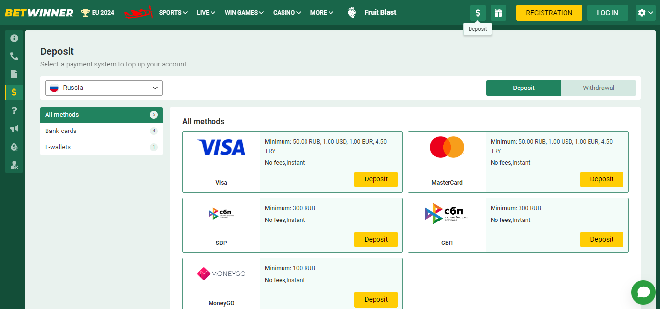 The minimum deposit required to qualify for the Betwinner first deposit bonus is 1 EUR (or its's equivalent in foreign currency).