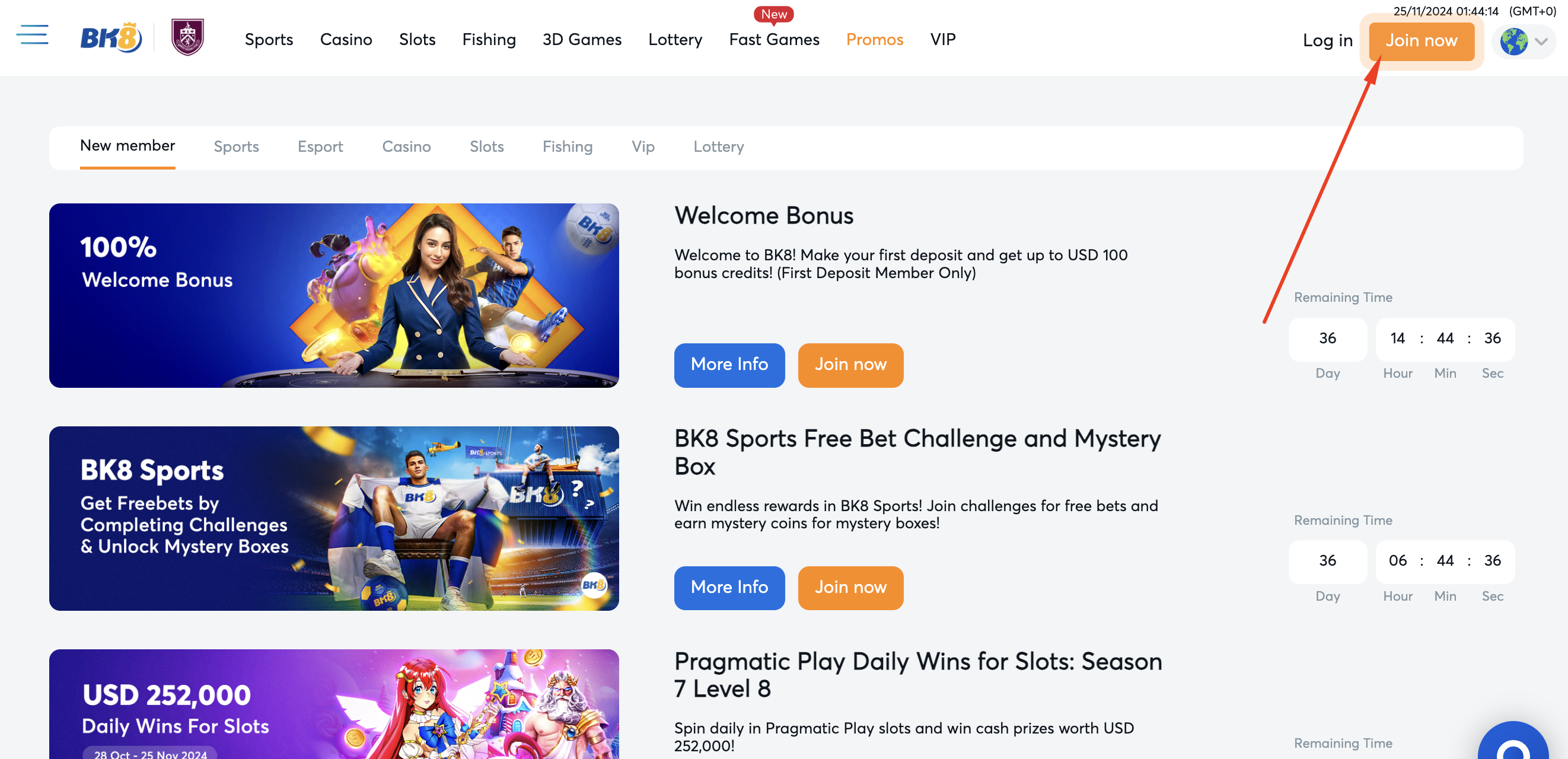 - Visit the BK8 official website and sign up by clicking the 'Join Now' button on the top right corner;