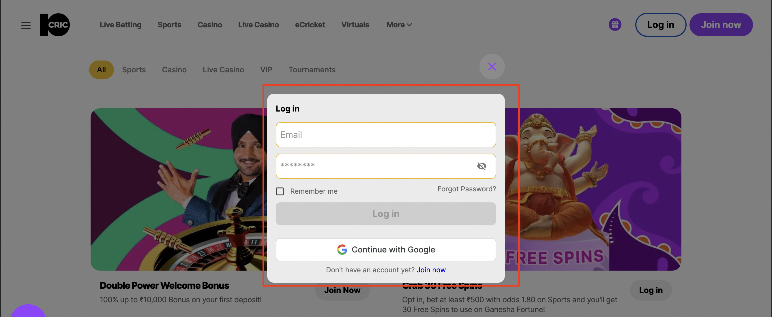 Visit the official 10Cric website and click on the "Join Now" button in the top-right corner. Fill in your personal details accurately, accept the terms and conditions, and complete your registration by clicking "Join Now."