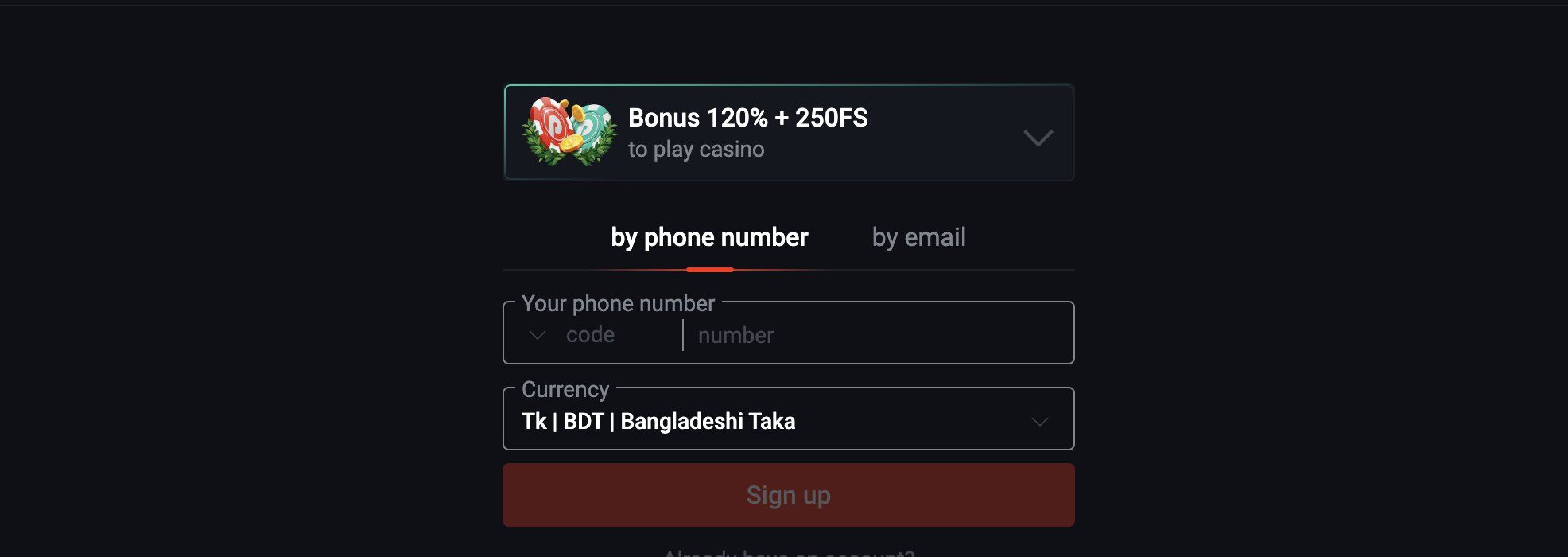 If you're new to Pin Up, complete the registration process to create your gaming account by simply visiting Pin-Up Bet India, locating and clicking on the registration button located on the top left corner of the landing page. Next, you will need to choose your first deposit bonus, your sign-up method, and your currency, in this case, the Bangladeshi Taka (BDT), then click on the sign-up button to complete your registration.