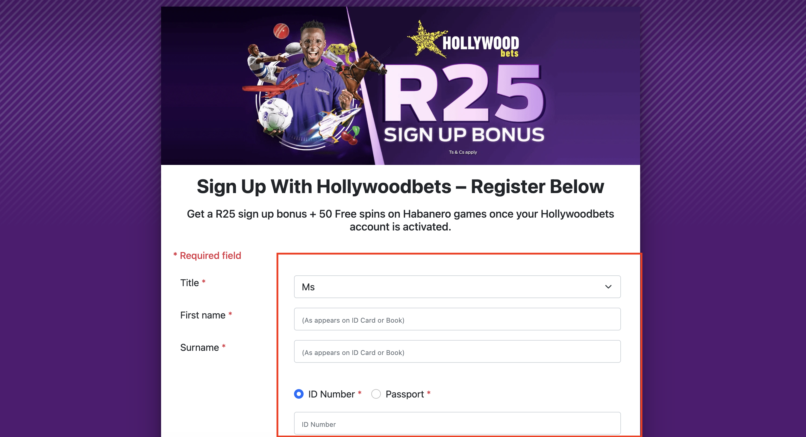 Register with HollywoodBets!Hollywoodbets Promo Code: No-deposit bonus of R25 and 50 free spins